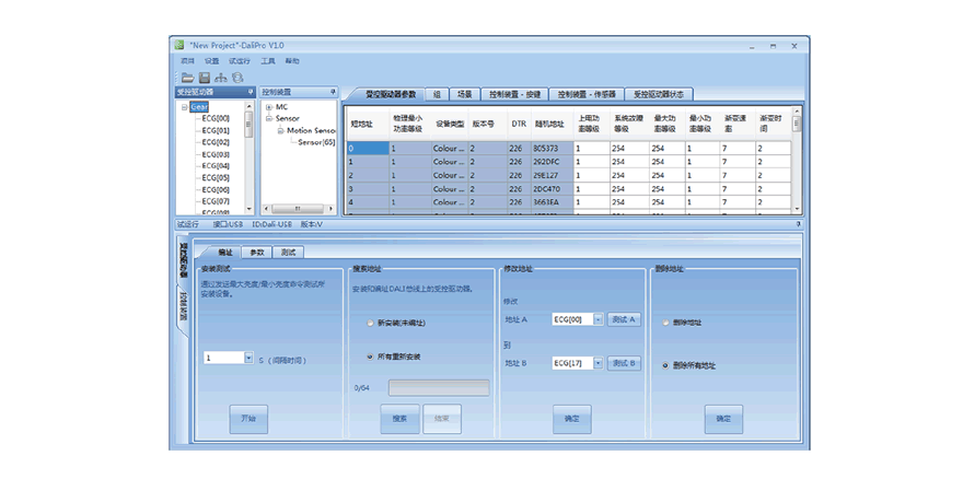 2、可以對DALI系統控制設備進行調試,尋址和功能設置(如DALI控制面板,移動傳感器和光照度傳感器等)。