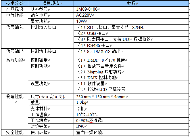 l? DMX512總線接口(Data、A、B、GND),控制系輸出點(diǎn)數(shù):DMX512:170點(diǎn)*8;