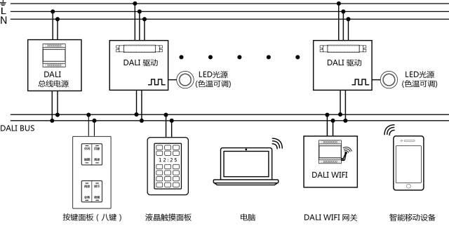 采用DALI照明控制系統(tǒng),DALI照明控制系統(tǒng)的布線結(jié)構(gòu)非常簡(jiǎn)單,燈具的供電回路無(wú)需預(yù)先分配,甚至可以將所有的燈具都并接在同一供電回路上,在鋪設(shè)供電線路時(shí)僅需要將所有燈具驅(qū)動(dòng)器及照明控制面板的DALI接口都并接在同一對(duì)DALI總線上即可完成線路的安裝,余下的照明功能配置完全依靠軟件實(shí)現(xiàn),且可以根據(jù)實(shí)際應(yīng)用的需要及個(gè)人喜好任意修改。