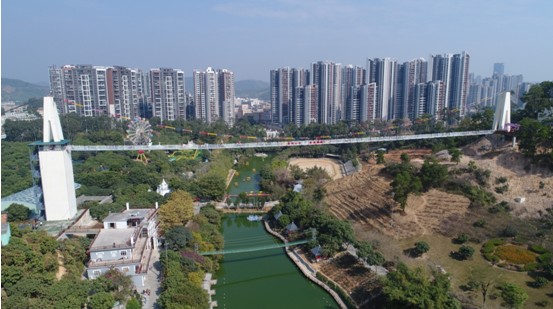 玻璃鵲橋是東莞龍鳳山莊影視度假村(中國唯一婚慶主題國家AAAA級旅游景區)的主打項目之一,堪稱廣東首坐3D全透明高空玻璃橋,橫跨山莊同心湖,全長333米,懸空88米,寬2.2米。從高遠望,宛如巨龍懸空倚在兩山之中,欲騰云沖天、霸氣十足。