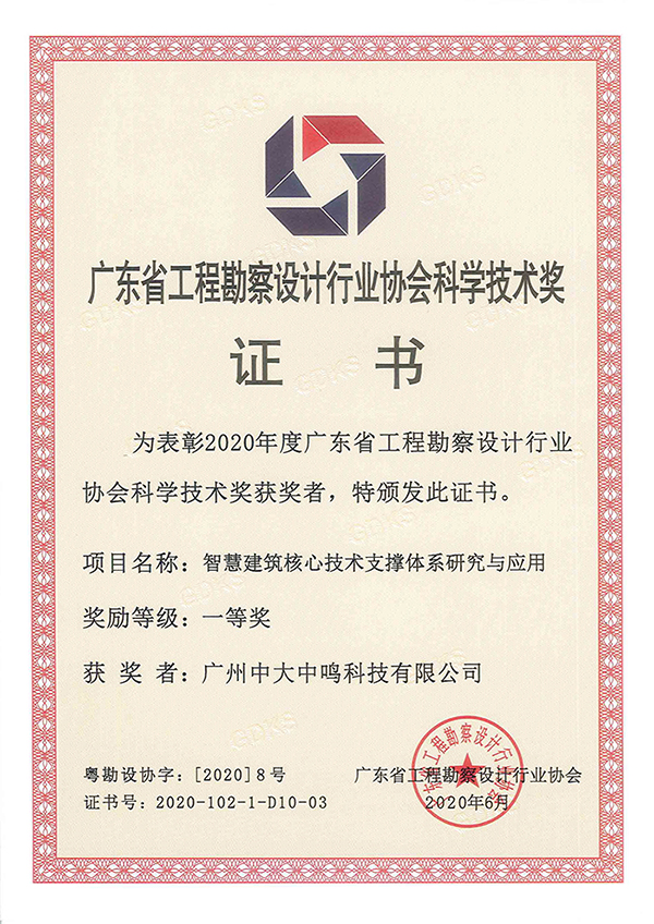 近日, 廣東省工程勘察設(shè)計(jì)行業(yè)協(xié)會(huì)舉辦2020年科學(xué)技術(shù)獎(jiǎng)評(píng)選,經(jīng)專家評(píng)審,由廣州中大中鳴科技有限公司聯(lián)合廣州市設(shè)計(jì)院等單位共同申報(bào)的 “智慧建筑核心技術(shù)支撐體系研究與應(yīng)用” 科研成果,榮獲2020年度廣東省工程勘察設(shè)計(jì)行業(yè)協(xié)會(huì)科學(xué)技術(shù)獎(jiǎng)一等獎(jiǎng)。該項(xiàng)目研究成果已在數(shù)多個(gè)項(xiàng)目中得到應(yīng)用,取得了顯著的經(jīng)濟(jì)效益和社會(huì)效益。