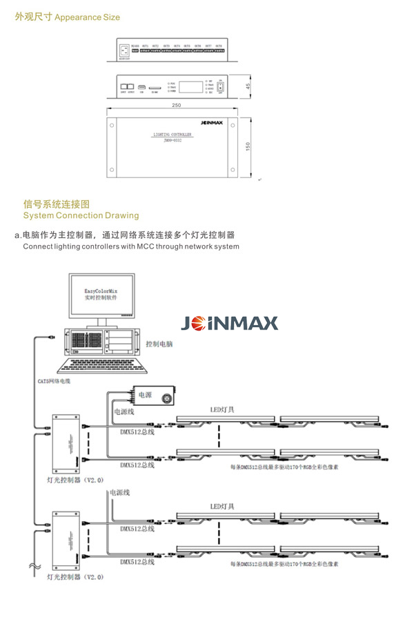 系統功能 System Function | 控制容量 Control Capacity | (1)?????? DMX:8 x 170像素? DMX: 8 x 170 pixels (2)?????? 串口:8 x 300像素?? Serial Port: 8 x 300 pixels |