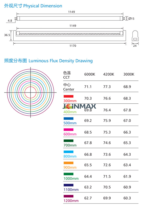 技術(shù)分類? Technical Classification? 項(xiàng)目規(guī)格Item 參數(shù) Parameter 電氣性能 Electrical Properties 工作電壓 AC90-265V 最大功耗? Max Power Consumption? 14W? 功率因素Power Factor ﹥0.90 光學(xué)性能??? Optical Properties 光源組成Lamp SMD LED 光通量Luminous Flux 850lm-1010lm 顯色指數(shù)Color Rendering Index? CRI﹥70 色溫Color Temperature 2760-6600K 光效值Luminous Efficacy 72lm/W 光束角Beam Angle 120° 光通維持率Luminous maintenance rate 25550 hour (@70)? 結(jié)構(gòu)性能? Structure 尺寸(長(zhǎng)*寬*高) Dimension (L*W*H) ?15*549 重量Weight 362g(含電源及支架)??? 362 (Power supply and fitting included) 燈體材料 Material PC/鋁/FR4??? PC/Aluminium/FR4 工作環(huán)境溫度? Work Temperature -20°C-55°C 工作環(huán)境濕度? Work Humidity ≤90%? 使用環(huán)境? Work Environment 室內(nèi)干燥環(huán)境???????? Indoor Dry Environment 型號(hào)對(duì)照表 Model List 供電方式????????? Input Voltage ?發(fā)光顏色?????????? LED Color 光通量????????????? Luminous Flux 產(chǎn)品編號(hào)??????? Model AC90-265V? 2760-3160K 850lm JZ23-224003-016 3920-4600K 960lm JZ23-224002-016 5450-6600K 1010lm JZ23-224001-016