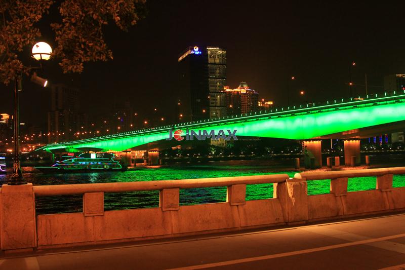 Project description: The Liberation bridge, Jiangwan Bridge, Haiyin Bridge, are located over the Pearl River, Guangzhou. The designing concept is to collocate with appropriate lamp and simple line sketch to accentuate the structural beauty of the bridge , bring visual pleasures for the viewers and make the city landscape of Guangzhou more charming and attractive. Joinmax provides self-developed LED lamp and optical fiber circuit control system with the latest concept and notion to this whole light project and make the extraordinary bridge more splendid.